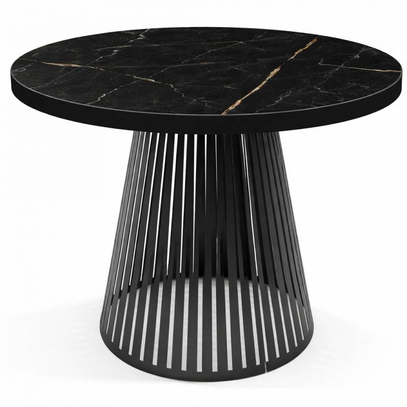 Išskleidžiamas valgomojo stalas NORE su moderniu ažūriniu pagrindu ir apvaliu laminuotu stalviršiu. Estetika, funkcija ir elegancija viename.