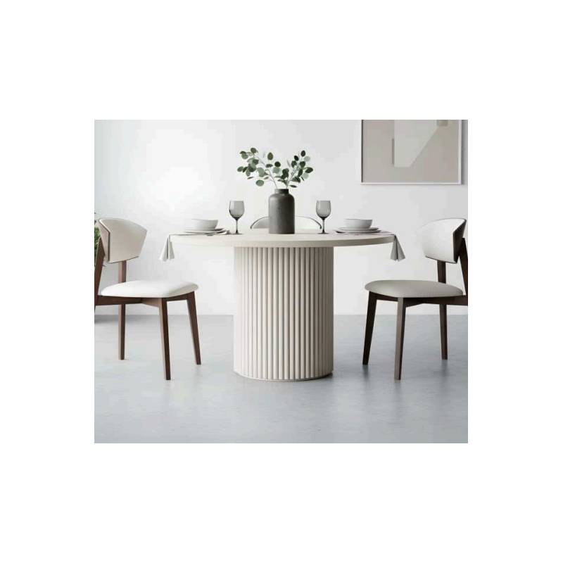 ALEGRE valgomojo stalas išsiskiria elegantiška apvalia forma ir dekoratyvia gofruota koja, kuri tampa pagrindiniu dizaino akcentu. Apvali stalviršio forma kuria jaukią atmosferą ir skatina patogų bendravimą prie stalo.