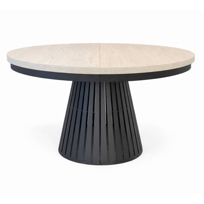 Išskleidžiamas valgomojo stalas NORE su moderniu ažūriniu pagrindu, žiedu ir apvaliu laminuotu stalviršiu. Estetika, funkcija ir elegancija viename.