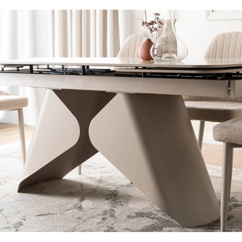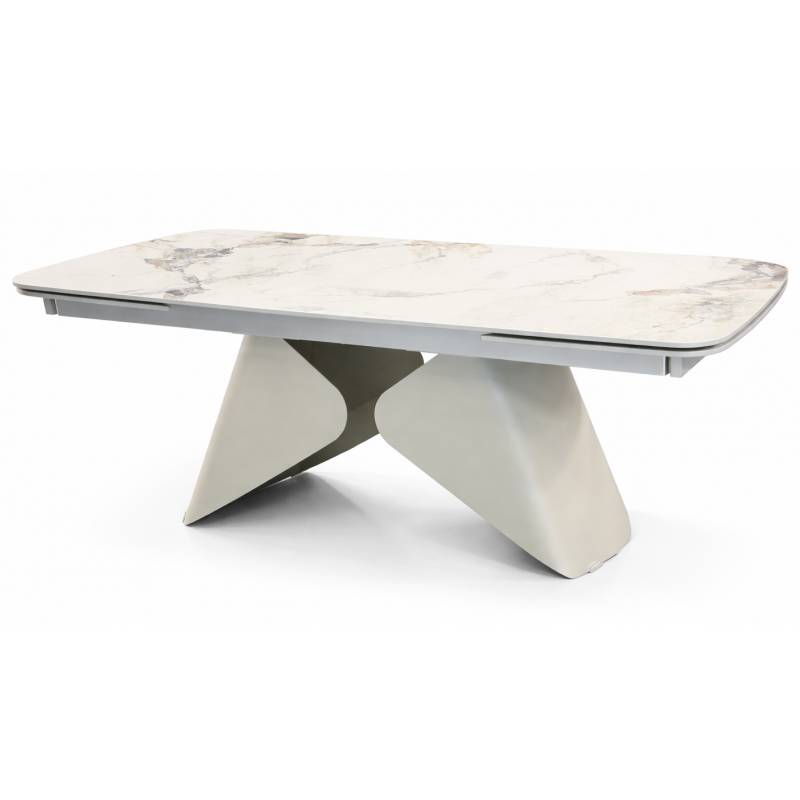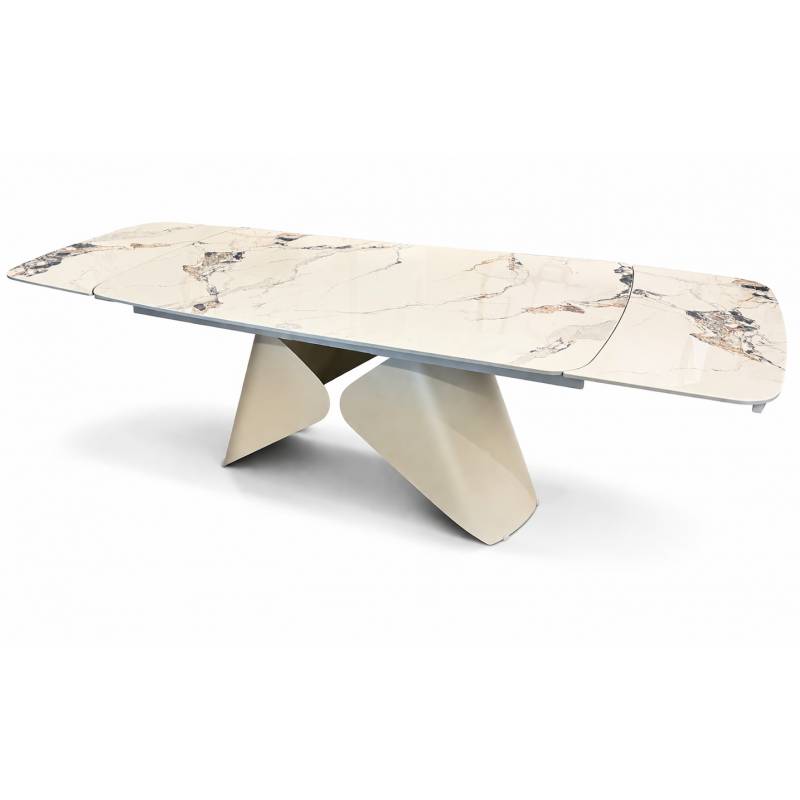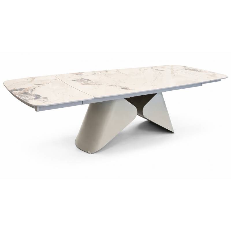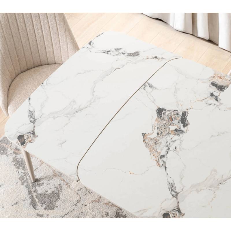 Prabangus išskleidžiamas stalas su marmuro imitacijos stalviršiu ir kašmyro spalvos koja, suteikiantis erdvei elegancijos ir funkcionalumo.