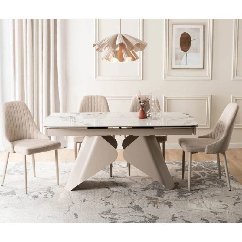 VERINA valgomojo stalas išsiskiria moderniu ir prabangiu dizainu, kuriame baltas marmuro imitacijos stalviršis dera su švelnios kašmyro spalvos koja. Išskleidimo mechanizmas leidžia patogiai praplėsti stalą iš šonų, todėl jis lengvai prisitaiko tiek kasdieniam naudojimui, tiek didesniems susibūrimams.