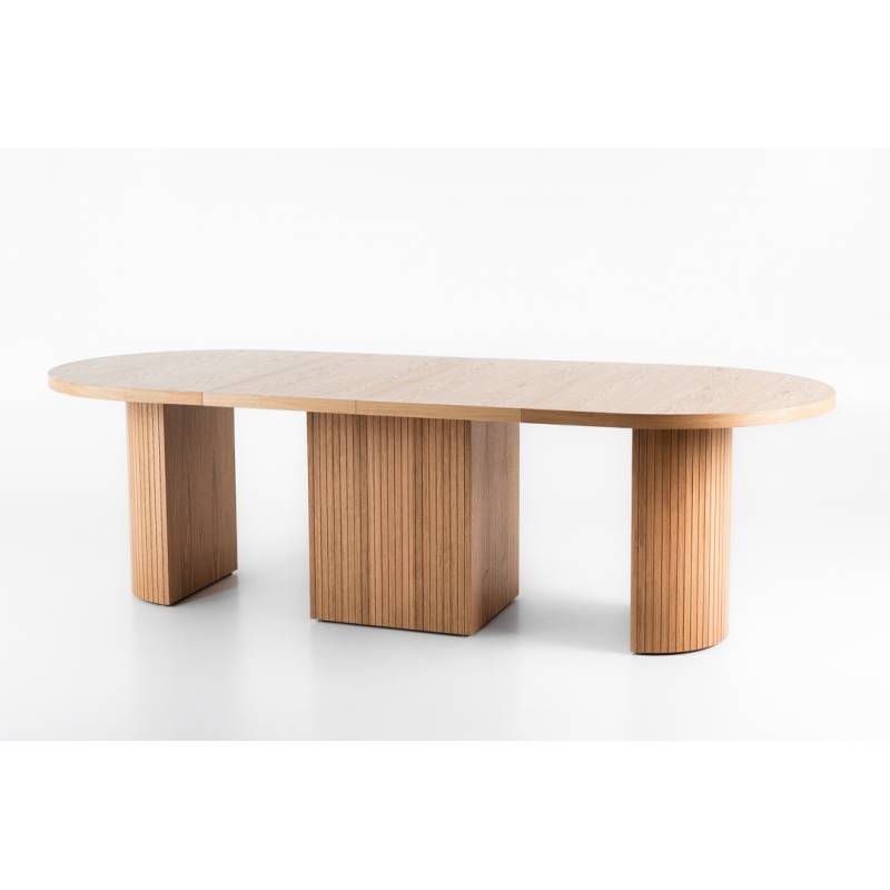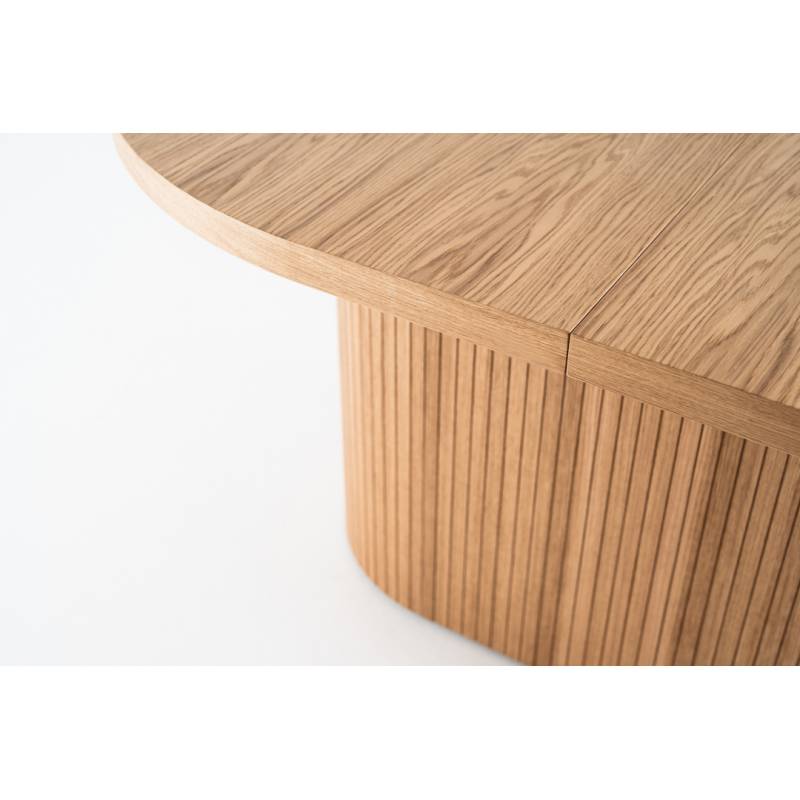 Elegantiškas ovalus ąžuolo faneruotės valgomojo stalas, išsiskleidžiantis nuo 160 iki 260 cm. Modernus dizainas, stilizuota centrinė koja.