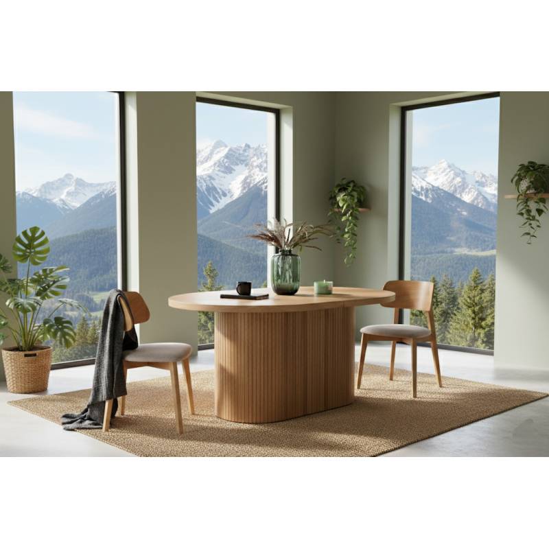 BUSSON – tai išskirtinio dizaino ovalus valgomojo stalas, sukurtas derinti eleganciją, funkcionalumą ir modernų estetinį pojūtį. 4 cm storio ąžuolo faneruotės stalviršis pasižymi natūraliu medžio raštu, kuris interjerui suteikia jaukumo, šilumos ir ilgaamžiškos klasikos įspūdį. Dėl išskleidžiamo mechanizmo stalas lengvai transformuojamas iš kasdienio 160 cm ilgio varianto į net 260 cm, tad tampa puikiu pasirinkimu tiek šeimos kasdienybei, tiek didesniems susibūrimams.