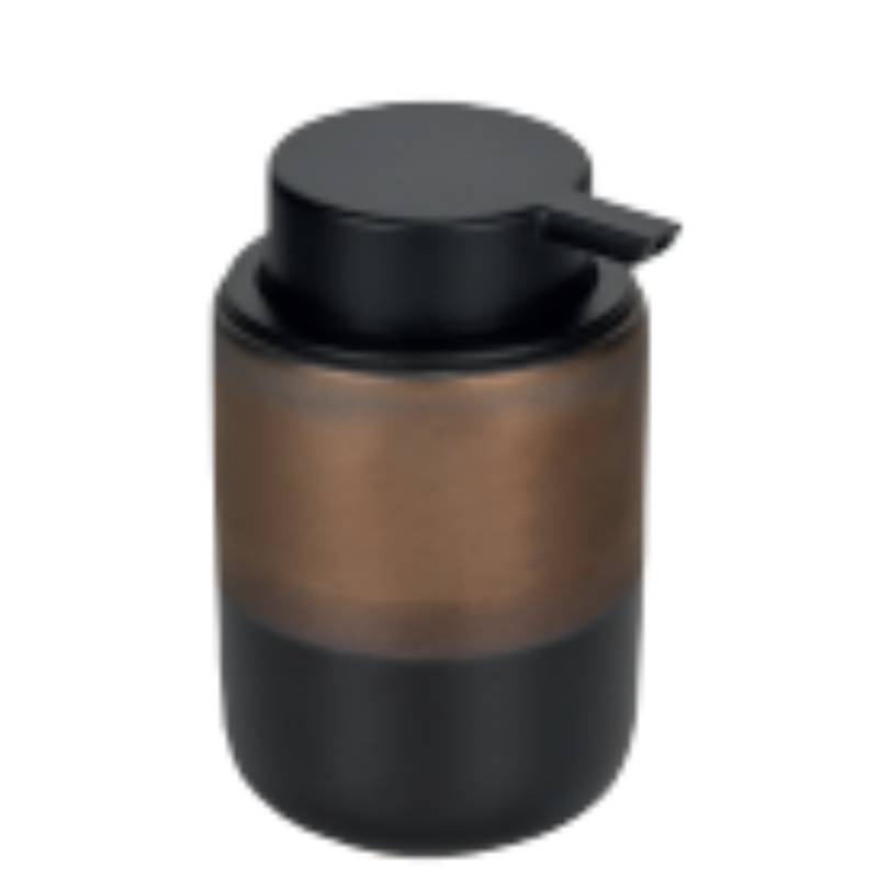 Keramikinis muilo dozatorius su juodos ir bronzinės spalvos deriniu, suteikiantis vonios kambariui elegancijos ir modernumo.