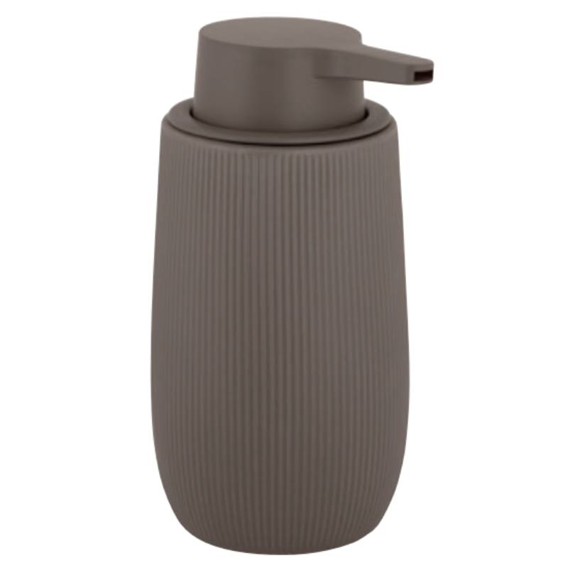 Keramikinis muilo dozatorius tamsiai rudos spalvos su tekstūriniu paviršiumi, suteikiantis vonios kambariui jaukumo ir elegancijos.
